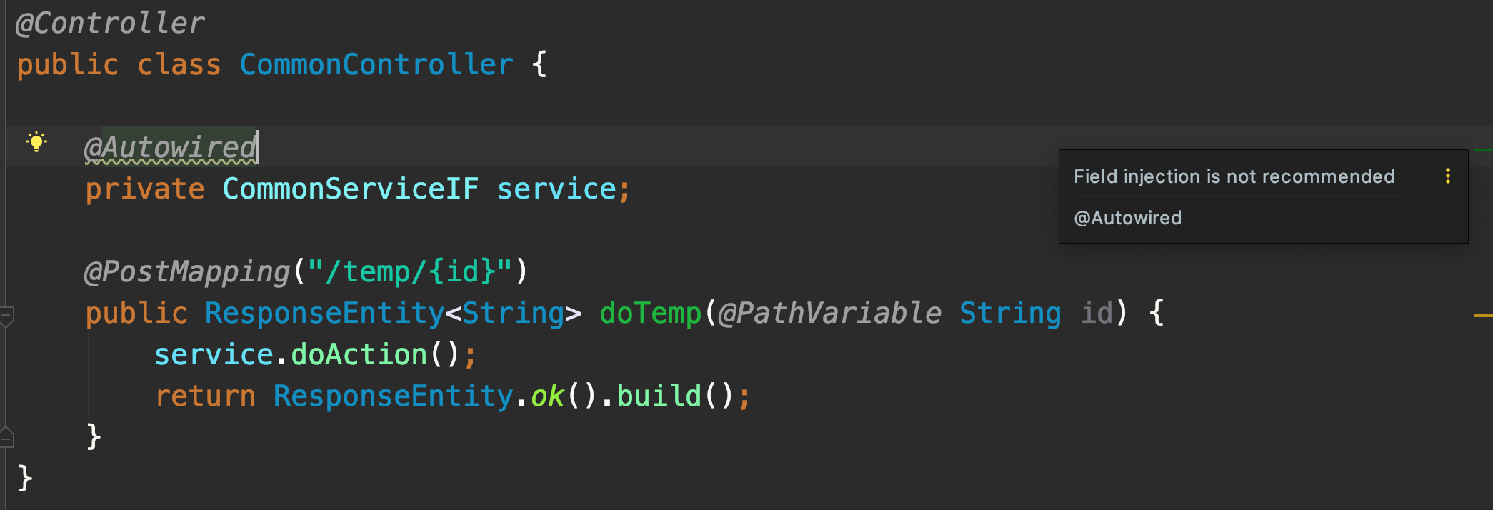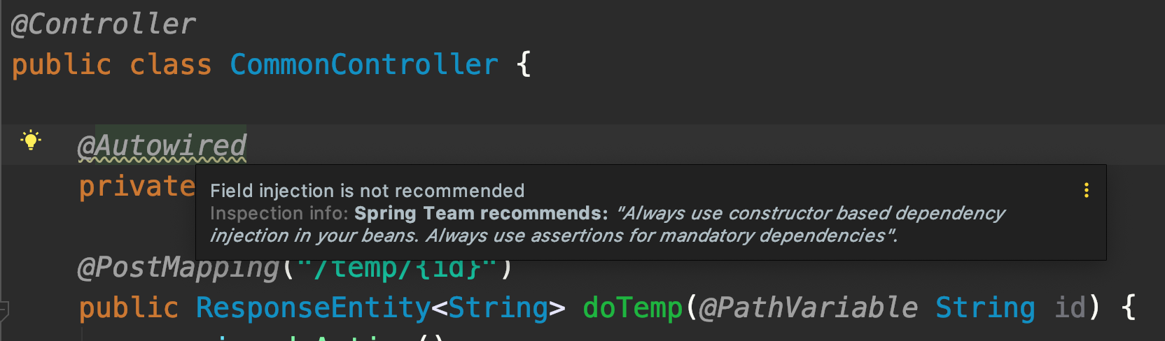 대부분 Intellij에서 다음과 같은 경고 때문에 이 글을 보고 있을 확률이 높습니다.