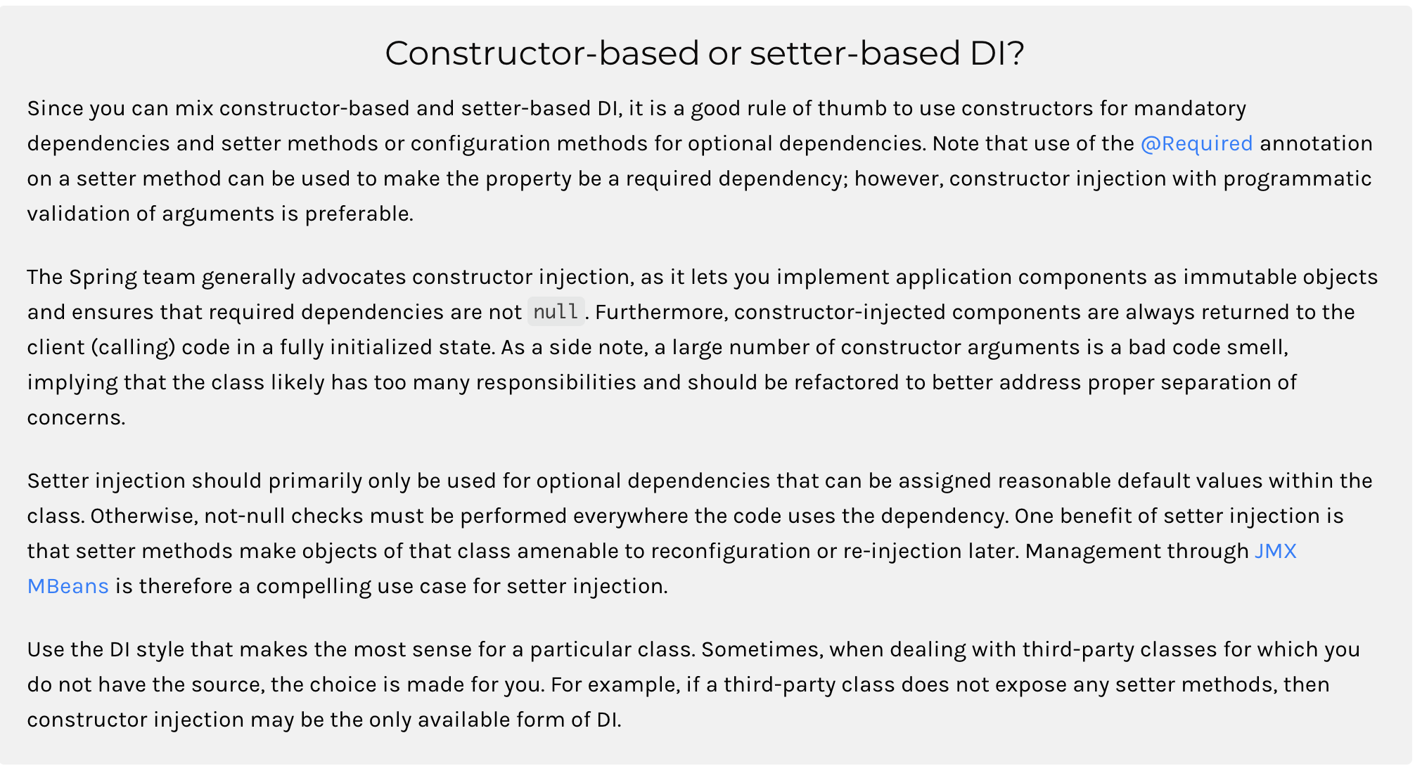 아직 Opional한 의존성을 겪어보지는 못했으니, 웬만한 경우에는 생성자 기반 DI를 사용하면 될 듯합니다.