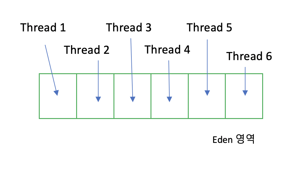 jvm은 eden 영역을 여러 버퍼로 나누어 thread 별로 다른 공간에 객체를 할당합니다.