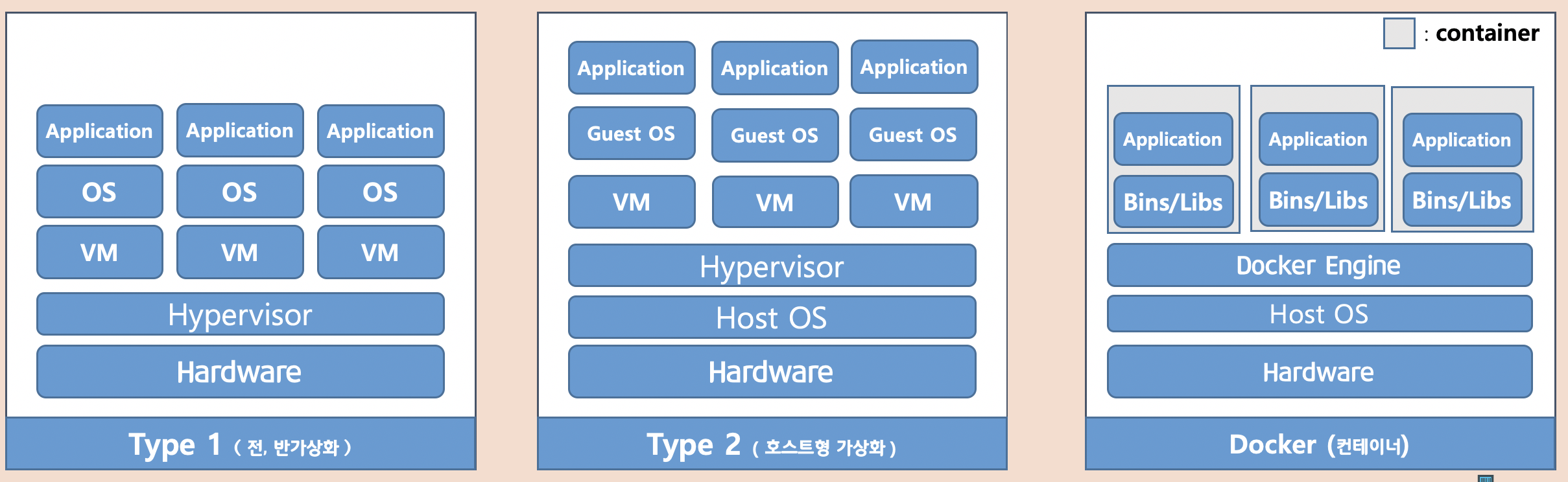 도커 이전의 가상화 기술은 크게 Type1 그리고 Type2 로 구분됩니다.