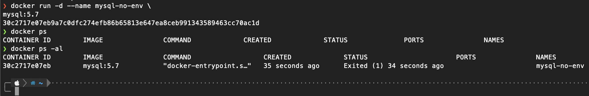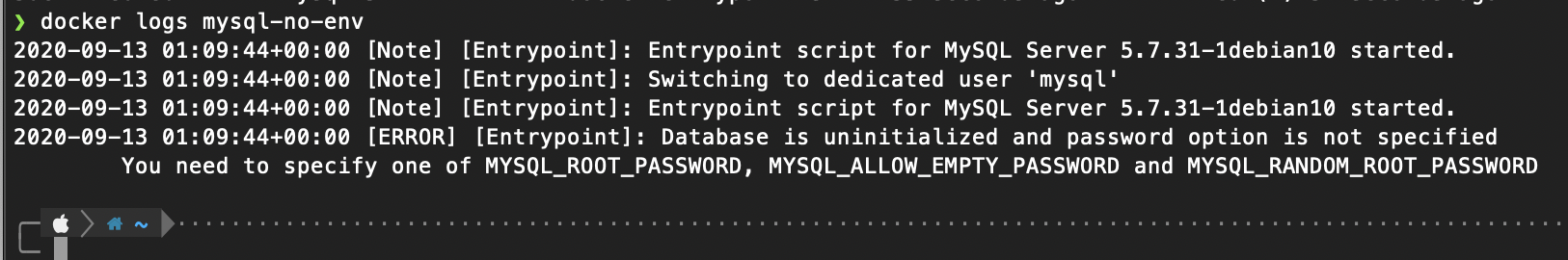 다음과 같이 실행했을 경우 정상적으로 컨테이너가 작동하지지만, 환경변수 없이 실행한다면 어떻게 될까요?