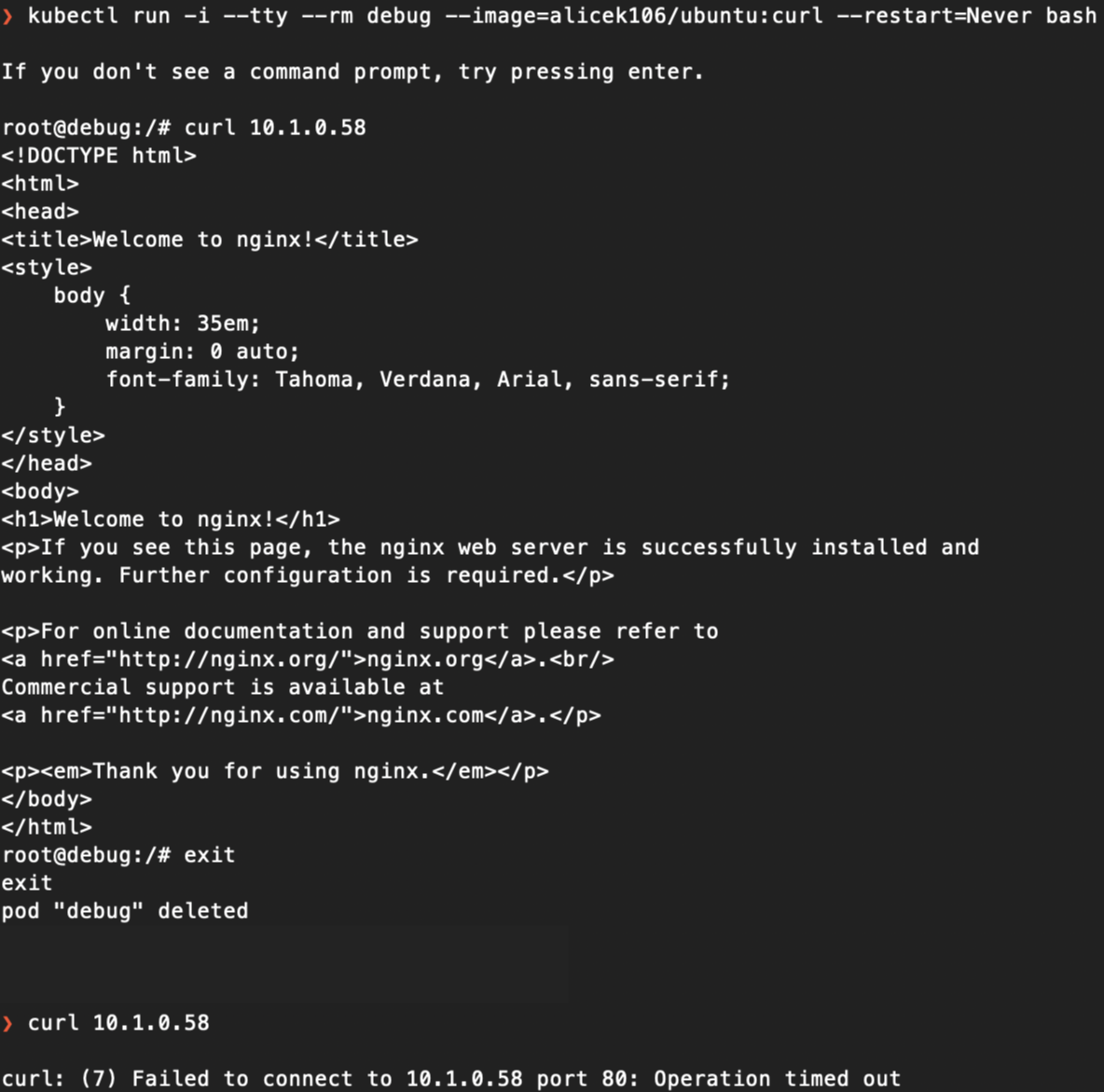 테스트용 파드를 만들어 접근해보니 nginx 초기 페이지가 응답으로 오는것을 볼 수 있습니다.