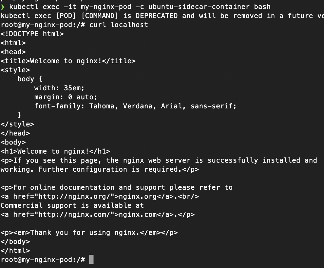kubectl exec -it my-nginx-pod -c ubuntu-sidecar-container bash