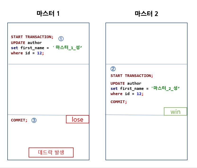 이와 같은 상황을 막기위해 1번에서는 데드락이 발생하게되고, 마스터 1의 write-set은 무시됩니다.