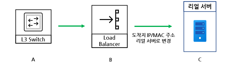 이후 LB에서는 목적지 IP 변경 없이 목적지의 MAC 주소만 리얼 서버의 MAC주소로 변경하여