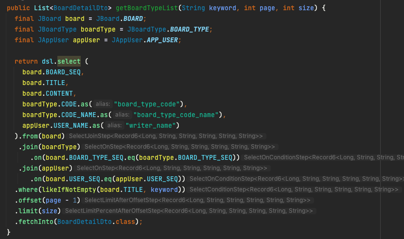 ( 이 문제점은 jOOQ와 동일한 컨셉의 QueryDSL-SQL에서도 발생합니다. )
