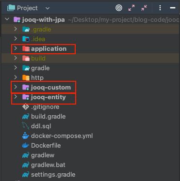 간단히 설명하자면, 단일 모듈로 된 프로젝트에서는 JPA 엔티티를 통해 jOOQ DSL을 생성할 수 없다는 뜻입니다.