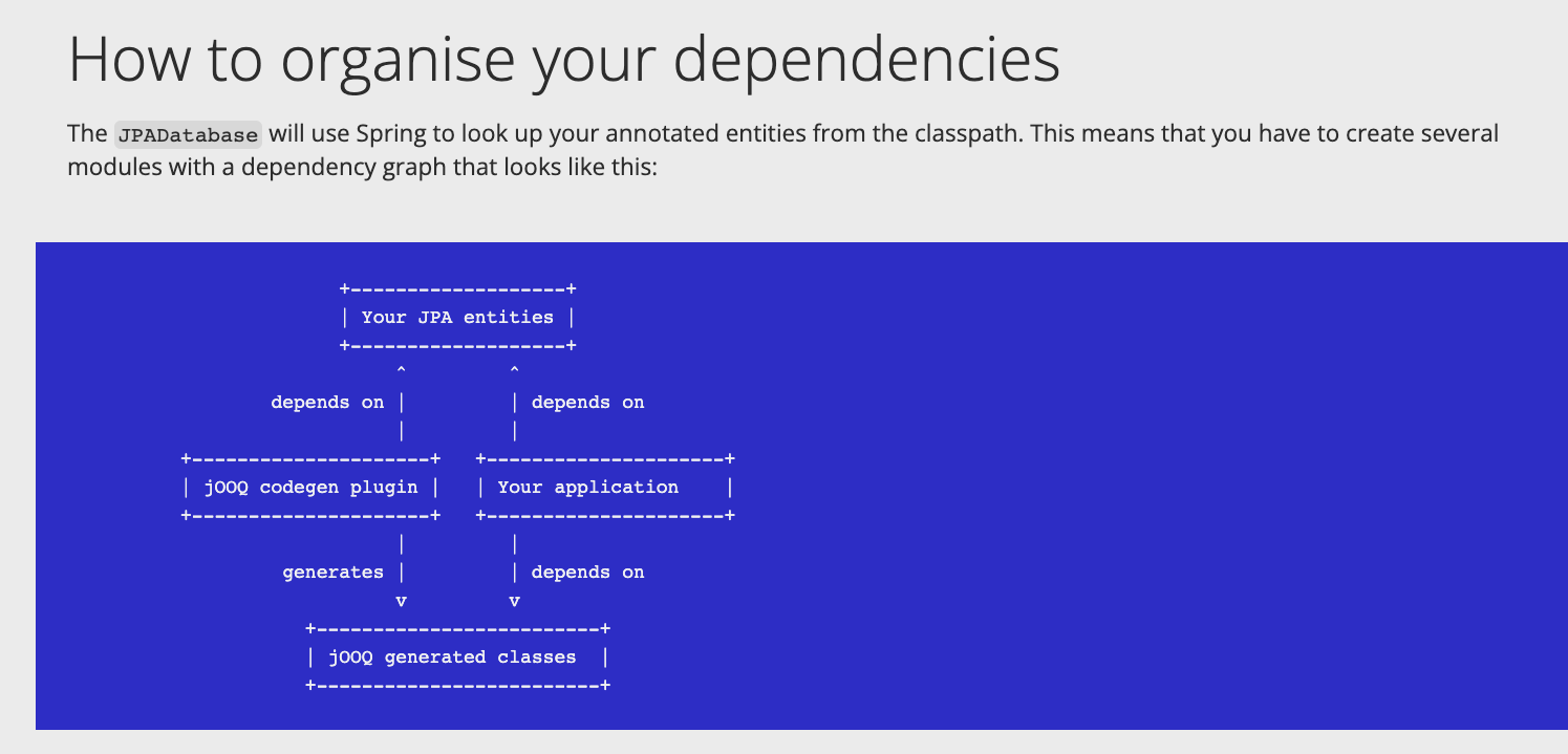 Question Summary) Is There a way to use JPA entity based jOOQ codegen in Gradle Project without using multi module? Hello, I'm tried to use jOOQ as a backup plan in project where JPA is mainly ...