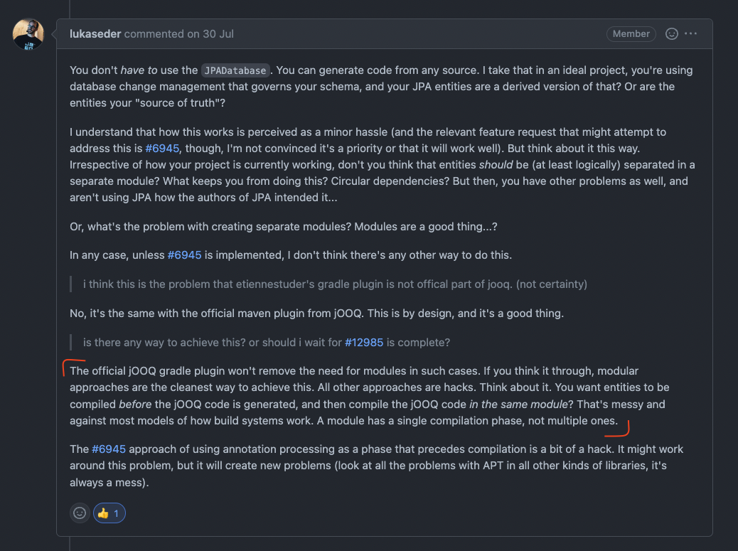 그래도 해결이 안 되면 jOOQ 깃헙으로가서 창시자에게 물어보는 등 많은 고통이 뒤따랐습니다.