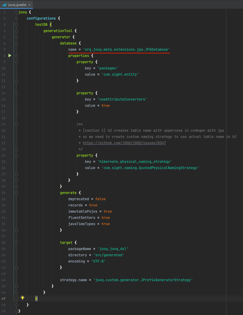 다음과 같이 jOOQ 설정에 JPADatabase를 사용하겠다고 명시하면