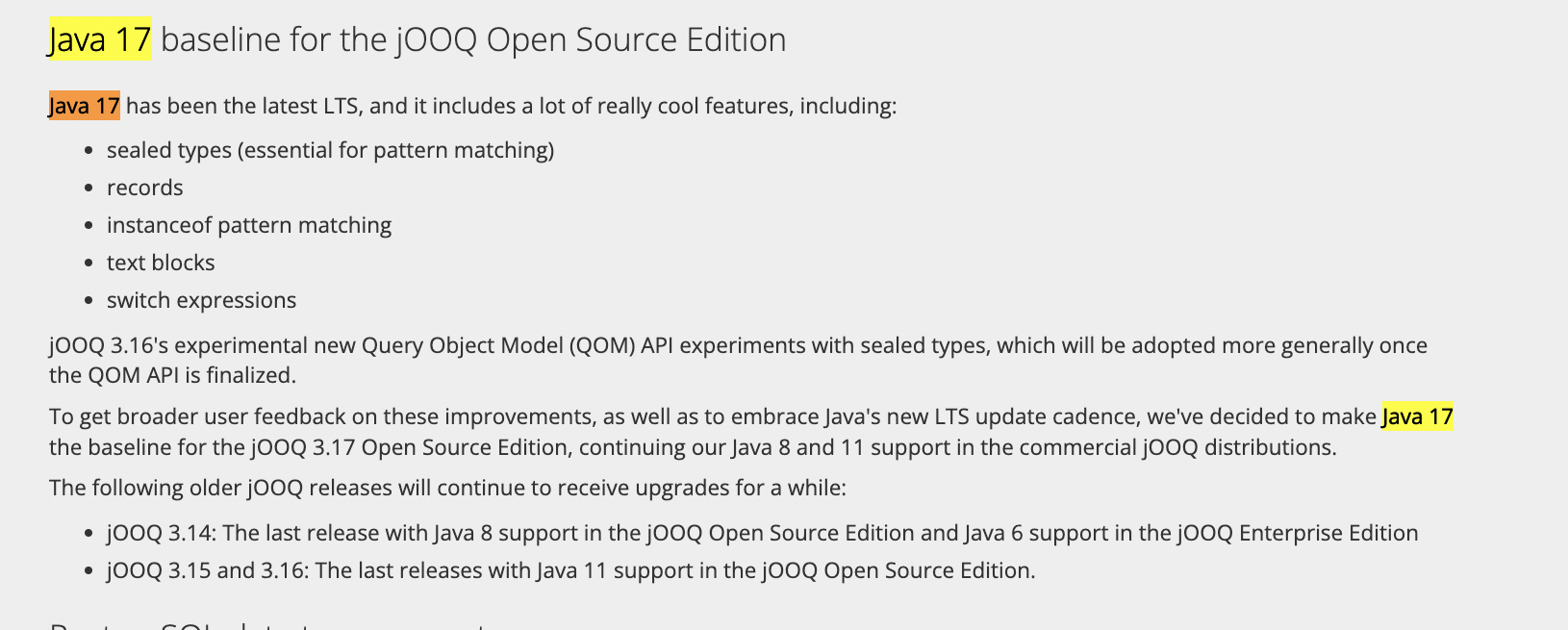 jOOQ는 3.17부터는 Java 17이 최소사양으로 요구됩니다. [2022.06 release]