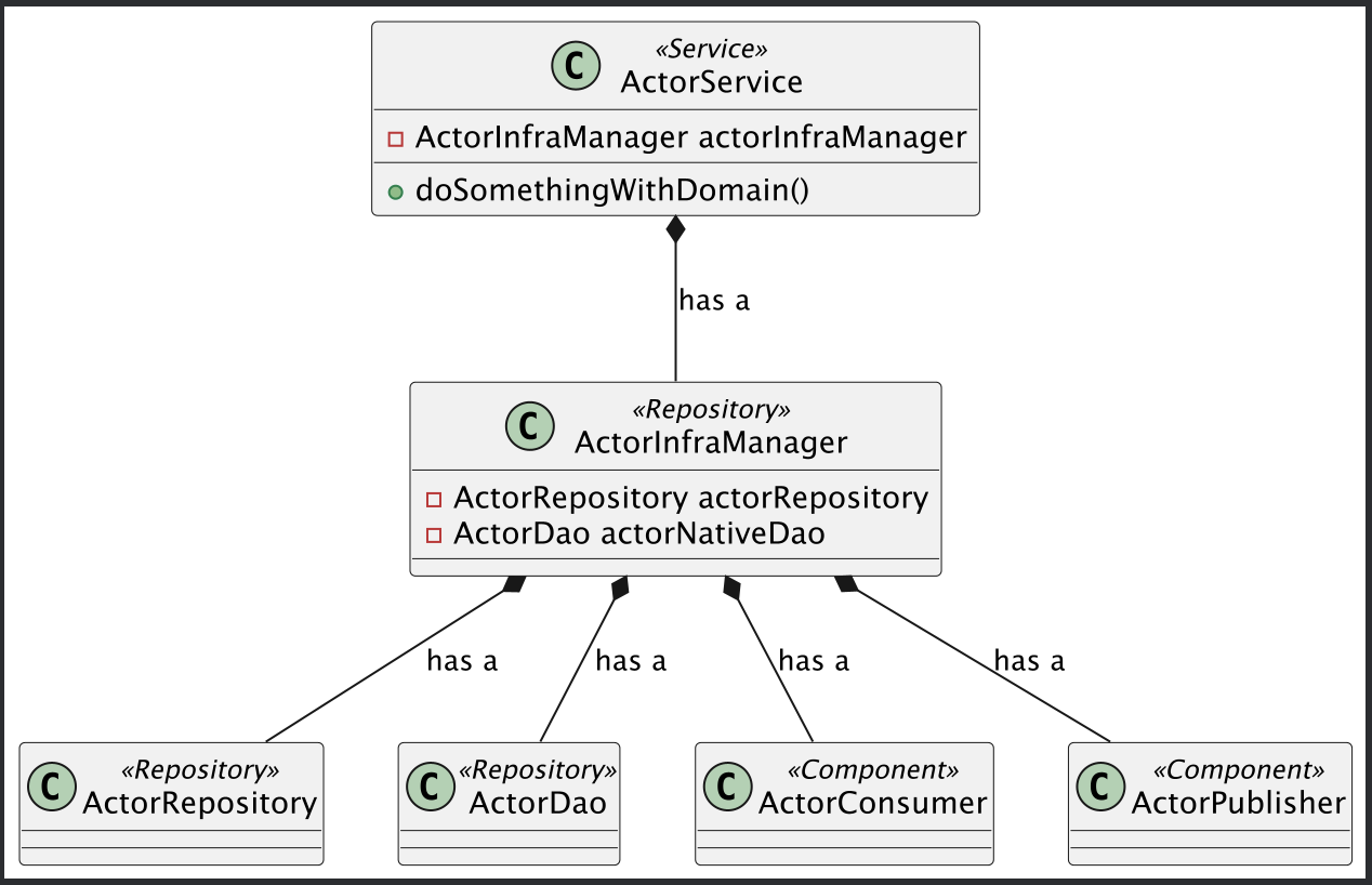 Serivce에서 직접적으로 Repository를 호출하지 말고 해당 도메인에 대응하는 퍼사드 클래스를 하나 만들어 이를 참조하도록 합니다. 이렇게 인프라스트럭처 레이어에 대한 명시적인 계층을 만들 수 있습니다.