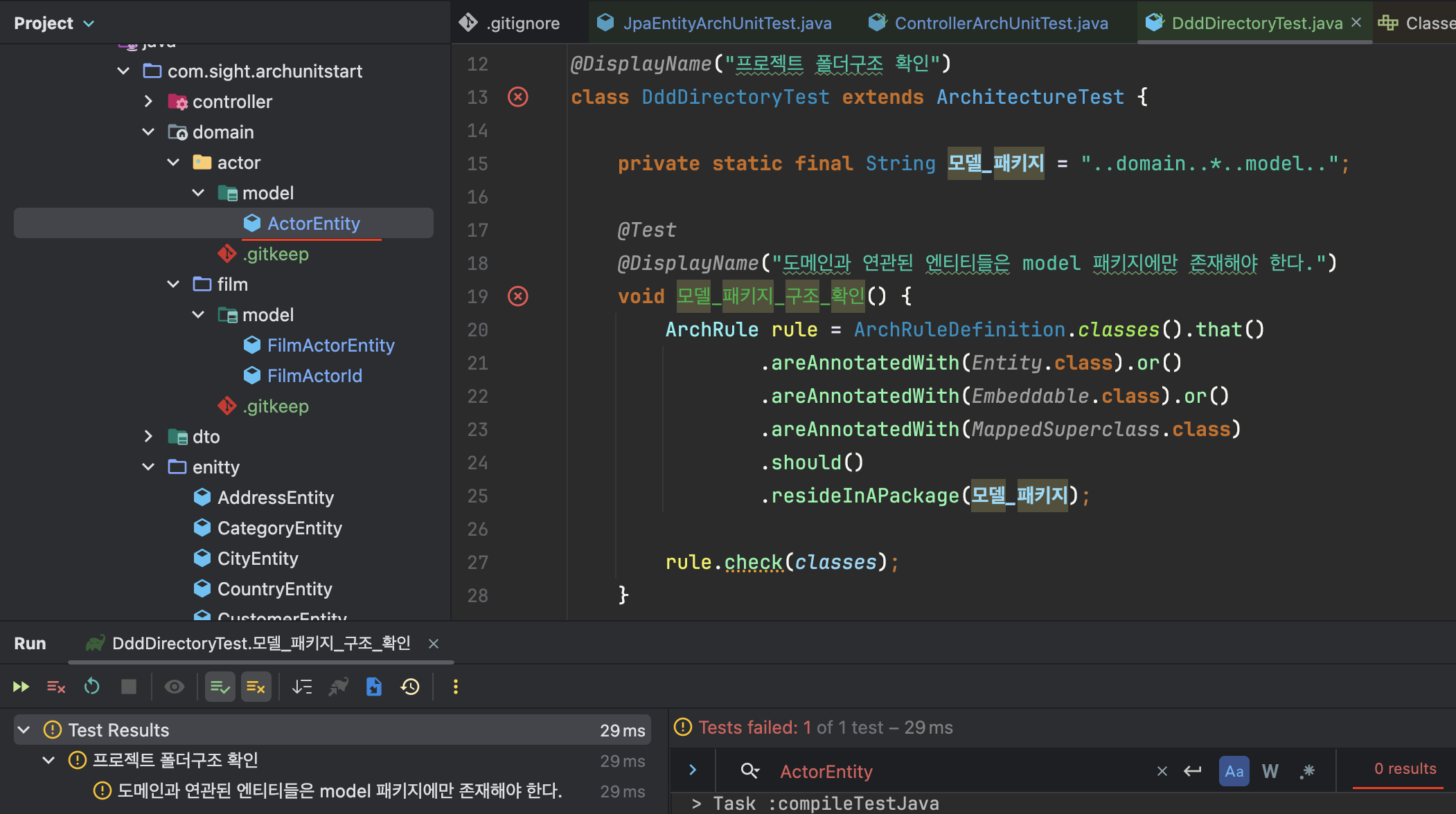 다음과 같이 JPA 엔티티들은 각 도메인 패키지의 모델 패키지 안에 넣도록 강제시킬 수 있습니다.
