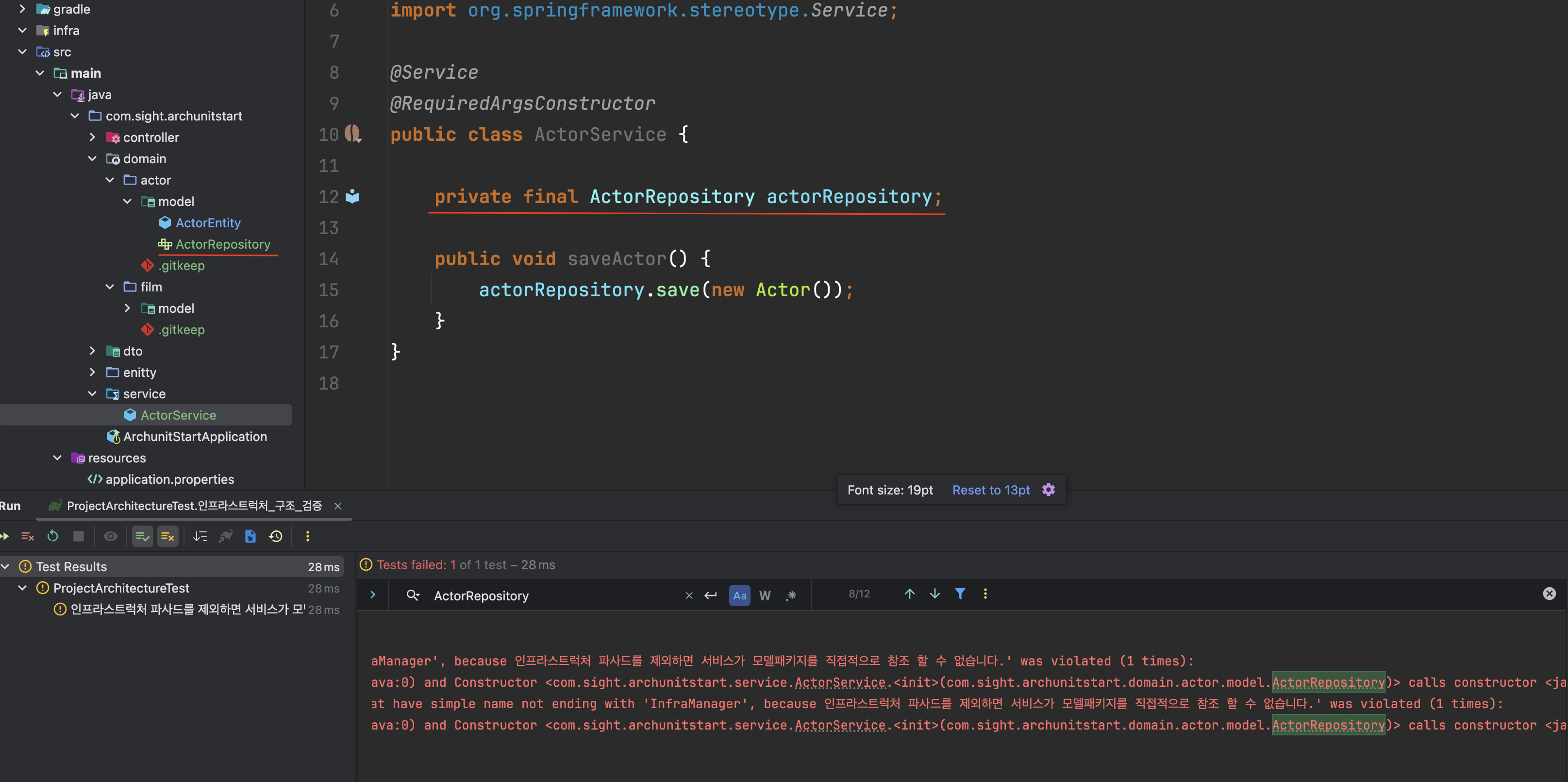 위의 아치유닛 테스트를 통해 아래처럼 서비스레이어가 직접적으로 JpaRepository를 참조하는 것을 방지할 수 있습니다.