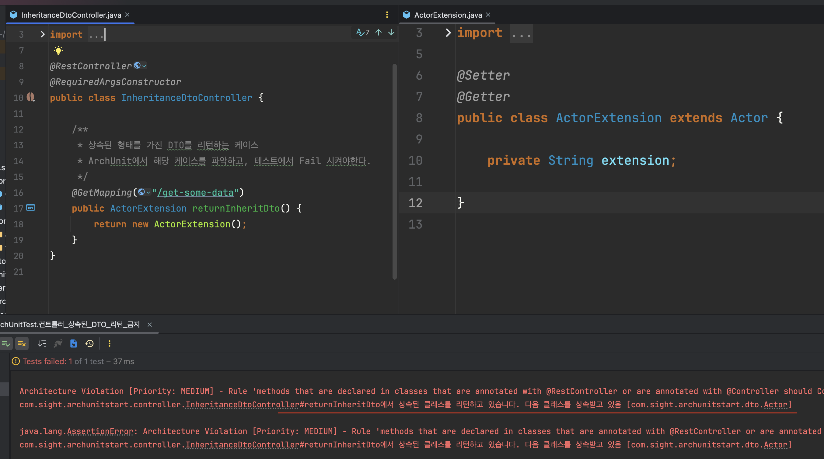 테스트코드를 실행해 보면 다음과 같이 상속된 클래스를 리턴하는 것을 탐지해서 에러를 발생시키는 것을 확인할 수 있습니다.