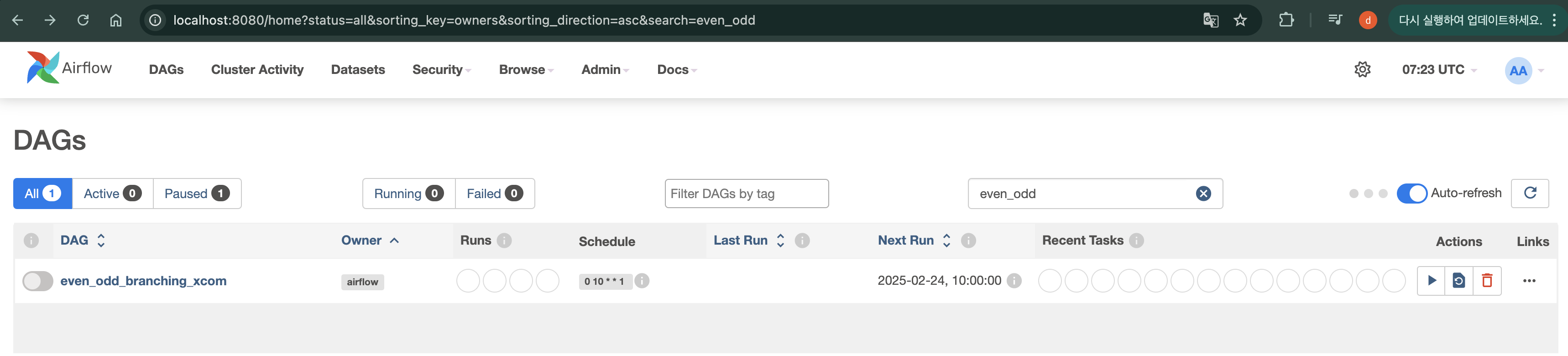 DAG폴더에 해당 파이썬 파일을 추가하면, localhost:8080에서 해당 DAG가 노출되는 것을 확인할 수 있습니다.