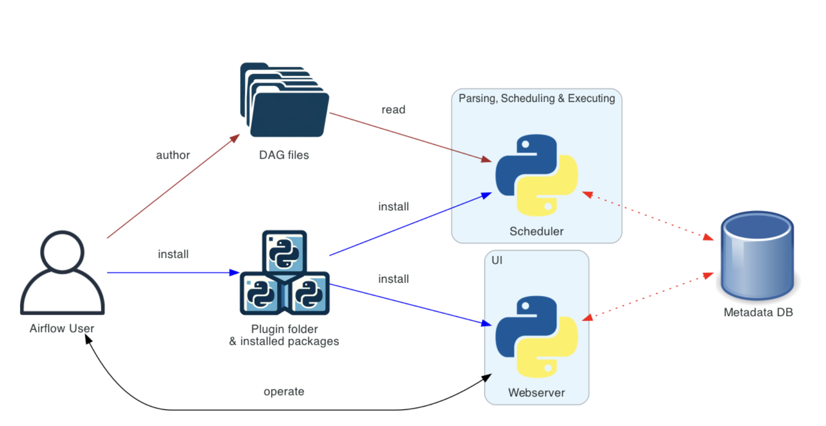 DAG 파일은 주기적으로 스케줄러가 로드하여 실행할 Task를 결정하며, 실행 상태는 Metadata DB에 저장됩니다.
